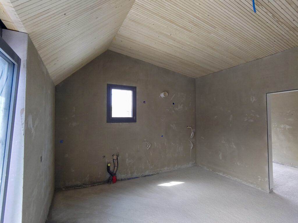 Juli 2023: Der Innenausbau hat begonnen (hier: Dachgeschoss mit Holzdecke).